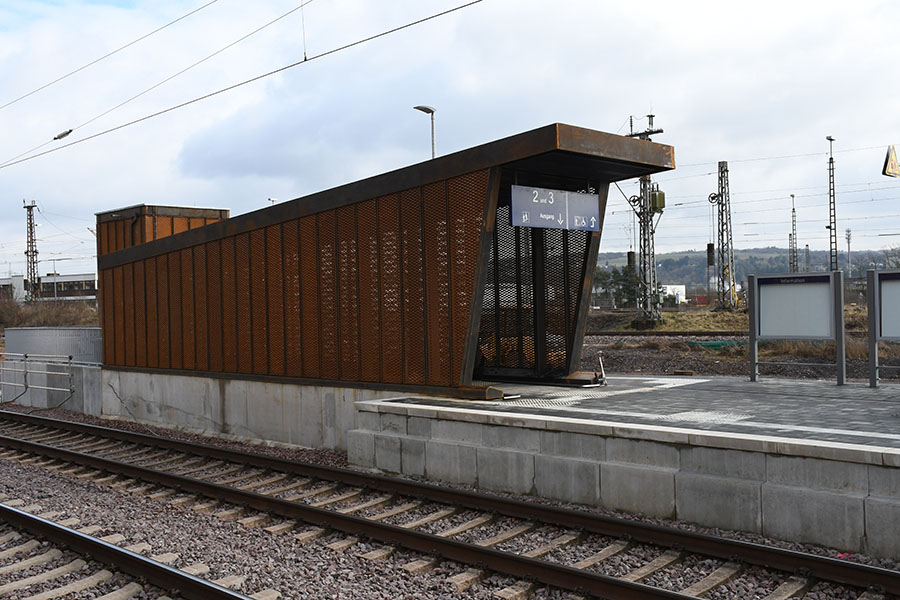 Ein Aufgang mit einem Wetterschutz aus Edelrost mündet auf einen Bahnsteig