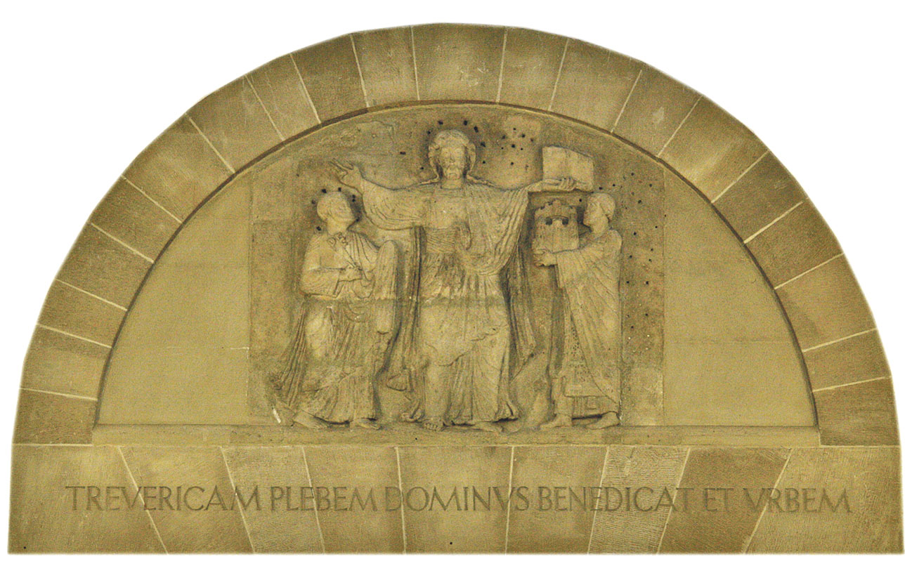 "Der Herr segne die Stadt Trier und ihre Einwohner" lautet übersetzt die Inschrift auf diesem romanischen Relief, auf dem Christus, Stadtpatron Petrus und der erste Trierer Bischof Eucharius abgebildet sind.