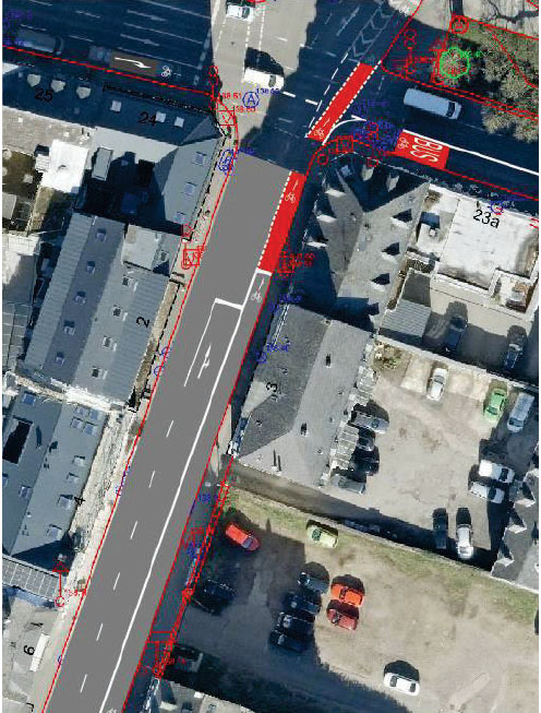 • Ebenfalls auf der Agenda stand die vom Ortsbeirat Trier-Süd angeregte Schaffung einer Radverkehrsführung an der Einmündung der Saarstraße in die Südallee. Hierfür wurden drei Varianten erörtert. Der Arbeitskreis favorisierte die Markierung eines Radfahrstreifens in Richtung Norden (siehe Abbildung). Hierfür würde die gesonderte Fahrspur für Rechtsabbieger wegfallen.