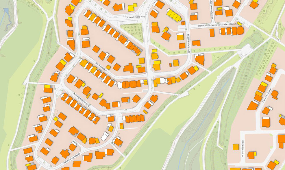 Bitte beachten Sie, dass im Rahmen der Solarpotenzialberechnungen insbesondere die Statik und eventuelle denkmalschutzrechtliche Auflagen nicht berücksichtigt und nur Dachflächen von Gebäuden in die Auswertung einbezogen wurden, die im April 2020 in den amtlichen Datengrundlagen dokumentiert sind.